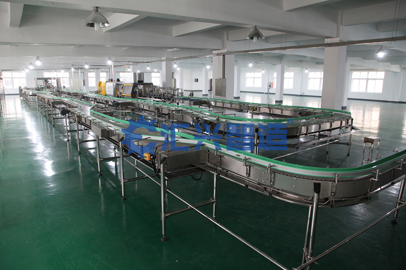鏈板輸送線以標(biāo)準(zhǔn)鏈板為承載面,由馬達(dá)減速機(jī)為動(dòng)力傳動(dòng);我們可以通過多列鏈板并行,使鏈板輸送線做的很寬并形成差速,利用多列鏈板的速度差使多列輸送在無(wú)擠壓的情況下變?yōu)閱瘟休斔停瑥亩鴿M足飲料貼標(biāo)、灌裝、清洗等設(shè)備的單列輸送的要求,同樣也可以使單列變成多列并行走緩慢,從而產(chǎn)生儲(chǔ)存量,滿足殺菌機(jī)、儲(chǔ)瓶臺(tái)、冷瓶機(jī)的大量供料的要求,我們可以將兩條鏈板輸送線的頭尾部做成重疊式的混合鏈?zhǔn)沟闷浚ü蓿w處于動(dòng)態(tài)過度狀態(tài),使輸送線上不滯留物料,可以滿足空瓶以及實(shí)瓶壓力和無(wú)壓力輸送。