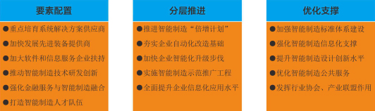 1、推動系統集成、裝備、軟件、信息技術、金融、人才服務等發展,打造一批有特色、有代表性重點企業,逐步形成智能制造系統解決方案供應商為龍頭,各供給要素聯合推進、多行業多層次應用企業深度參與的生態體系。