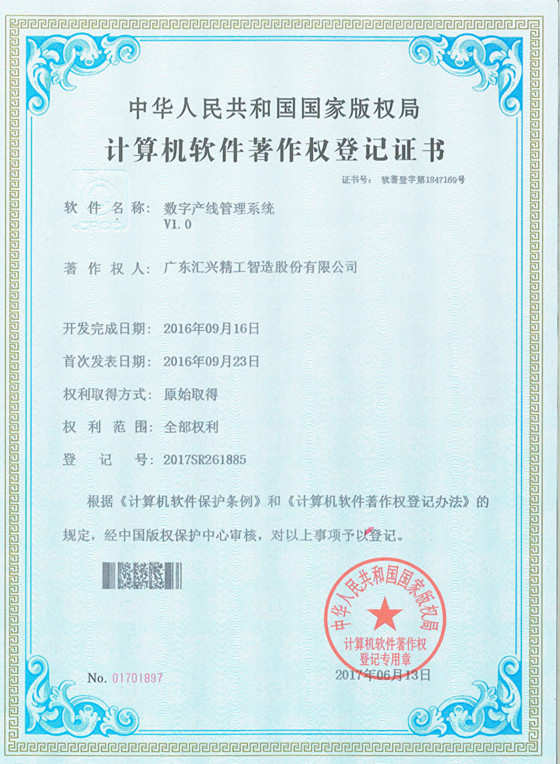 近日,匯興智造喜報頻傳,繼之前獲得多項發明專利和商標注冊之后,又參與國家標準的起草,如今再次獲得五項國家版權局計算機軟件著作權登記證書,它們分別是產品數字化追溯系統、車間生產工藝參數監控系統、車間生產設備維護管理系統、生產績效考核管理系統和數字產線管理系統這五大軟件。匯興智造17年來,精工制造各類智能自動化生產線,擁有行業深厚的經驗,在充分了解客戶的實際需求后,開發了產品數字化追溯系統等軟件,并取得相關著作權。其中,權利取得方式為原始取得,權利范圍為全部權利。