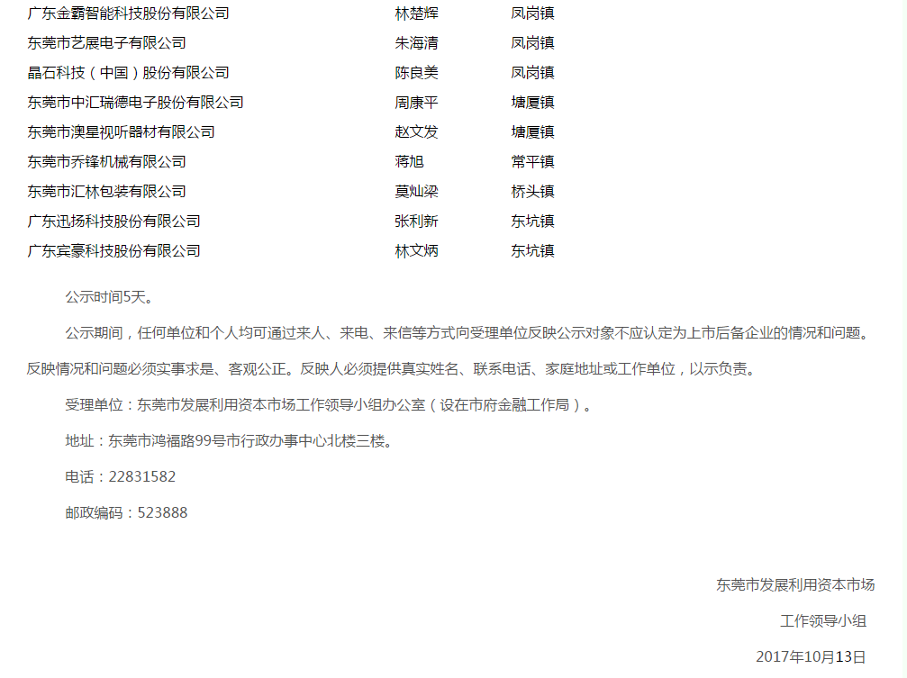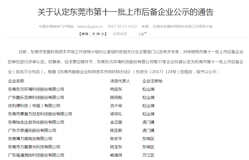 關于認定東莞市第十一批上市后備企業公示的通告