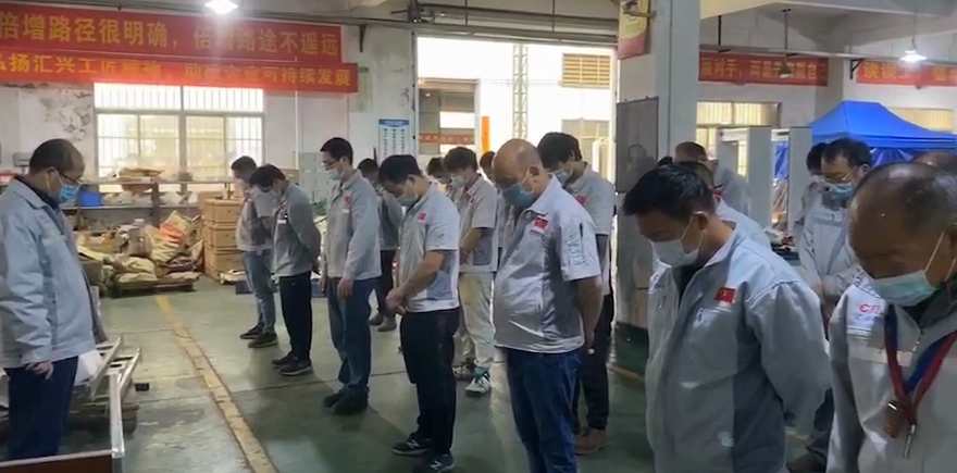 上午十點,董事長鐘輝親率生產車間仍在加班趕工口罩機的在廠員工,進行3分鐘哀悼,大家神情凝重肅立,靜立默哀。匯興全體員工以此表達對抗擊新冠肺炎疫情斗爭犧牲烈士和逝世同胞的深切哀悼。逝者安息,生者堅強。